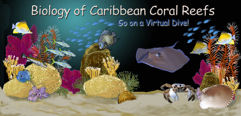 The BIOLOGY OF CARIBBEAN CORAL REEFS is presented as a VIRTUAL DIVE, with text, photographs, and videos. All topics in